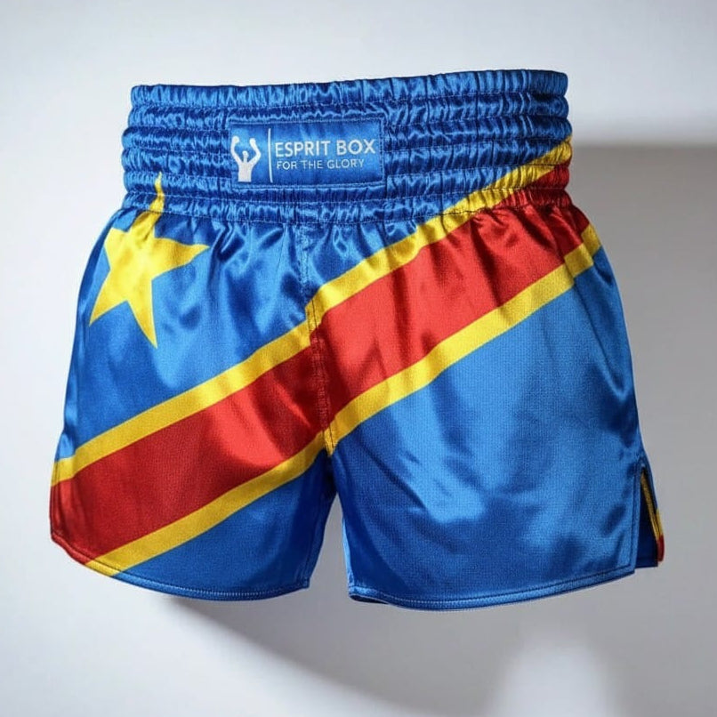 Short boxe Congo. Un short confortable et très agréable à porter, aux couleurs de la République Démocratique du Congo. Un produit officiel Esprit Boxe.