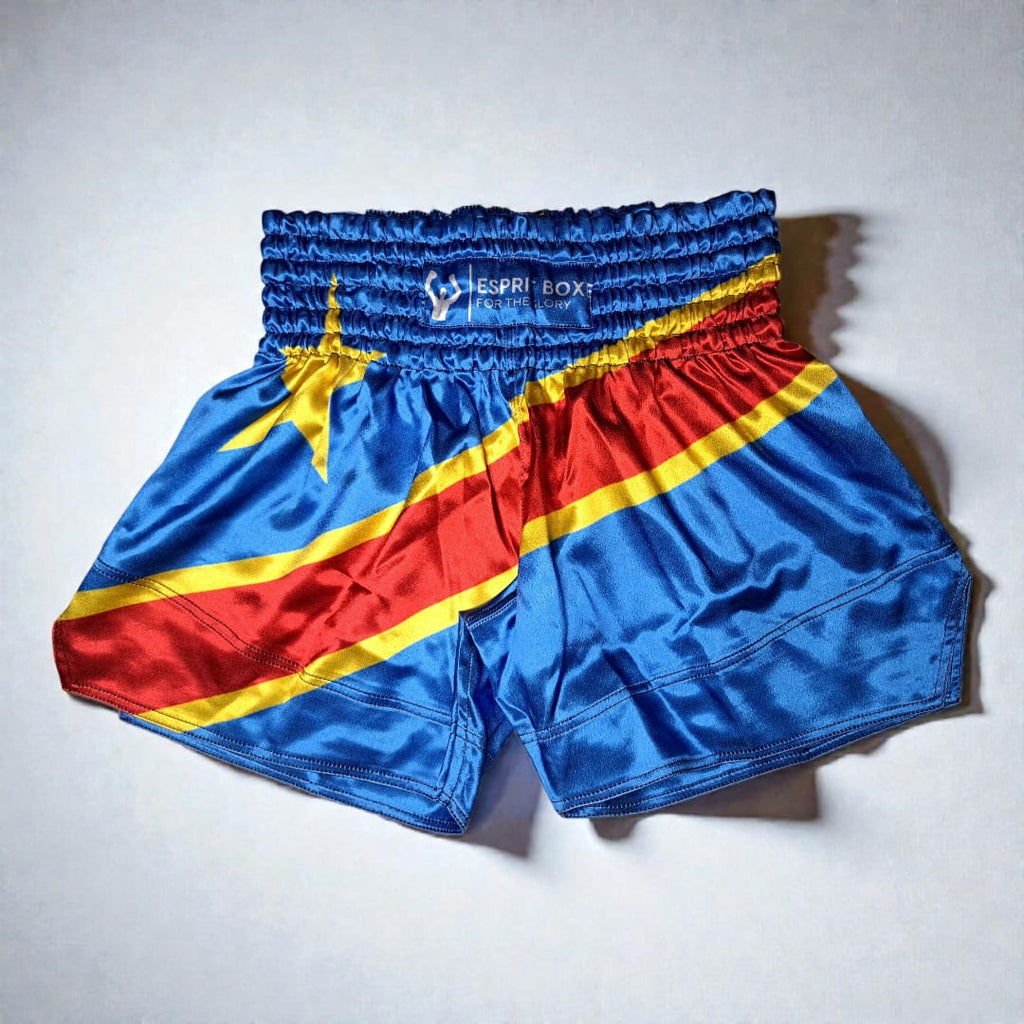Short boxe Congo. Un short confortable et très agréable à porter, aux couleurs de la République Démocratique du Congo. Un produit officiel Esprit Boxe.