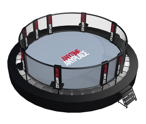 Cage MMA circulaire qui comprend l'ensemble de la structure en acier galvanisé, poteaux intermédiaires, parois treillis spécialement cintrées, plancher à 1m de hauteur, sidewalk de 1m de largeur, avec grilles pour installation lumières et installation TV. Couleur, logo et design modulable au choix du client.