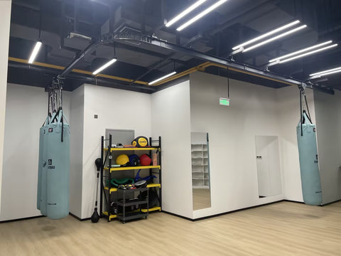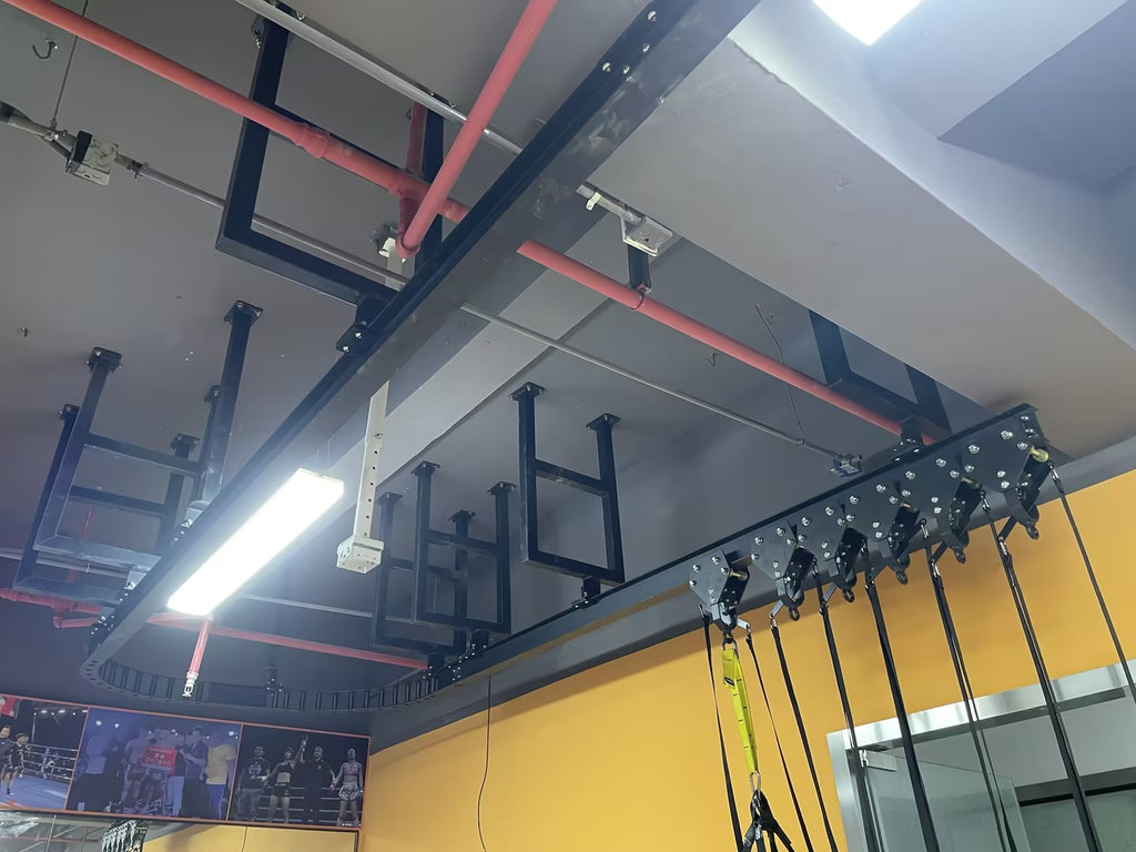 Rail de convoyage suspendu pour sac de frappe. Système à rail permettant de déplacer et ranger 4, 6 ou 8 sacs de frappe. Fixation sous poutre béton évitant un système à poteau.