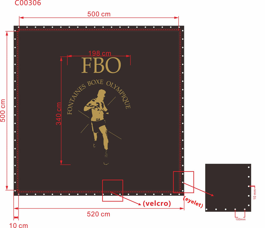 Bâche de ring épaisse en coton, vinyle ou toile cordura. Bâche adaptée aux dimensions de votre ring, couleur de votre choix, personnalisation inclue (logo club, logo partenaires... )