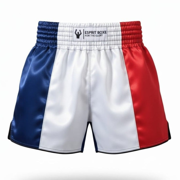 Short boxe France. Un short sport super cool, très agréable à porter, aux couleurs de la France. Soit fier de ton pays et de tes origines, et vit la boxe en bleu blanc rouge !